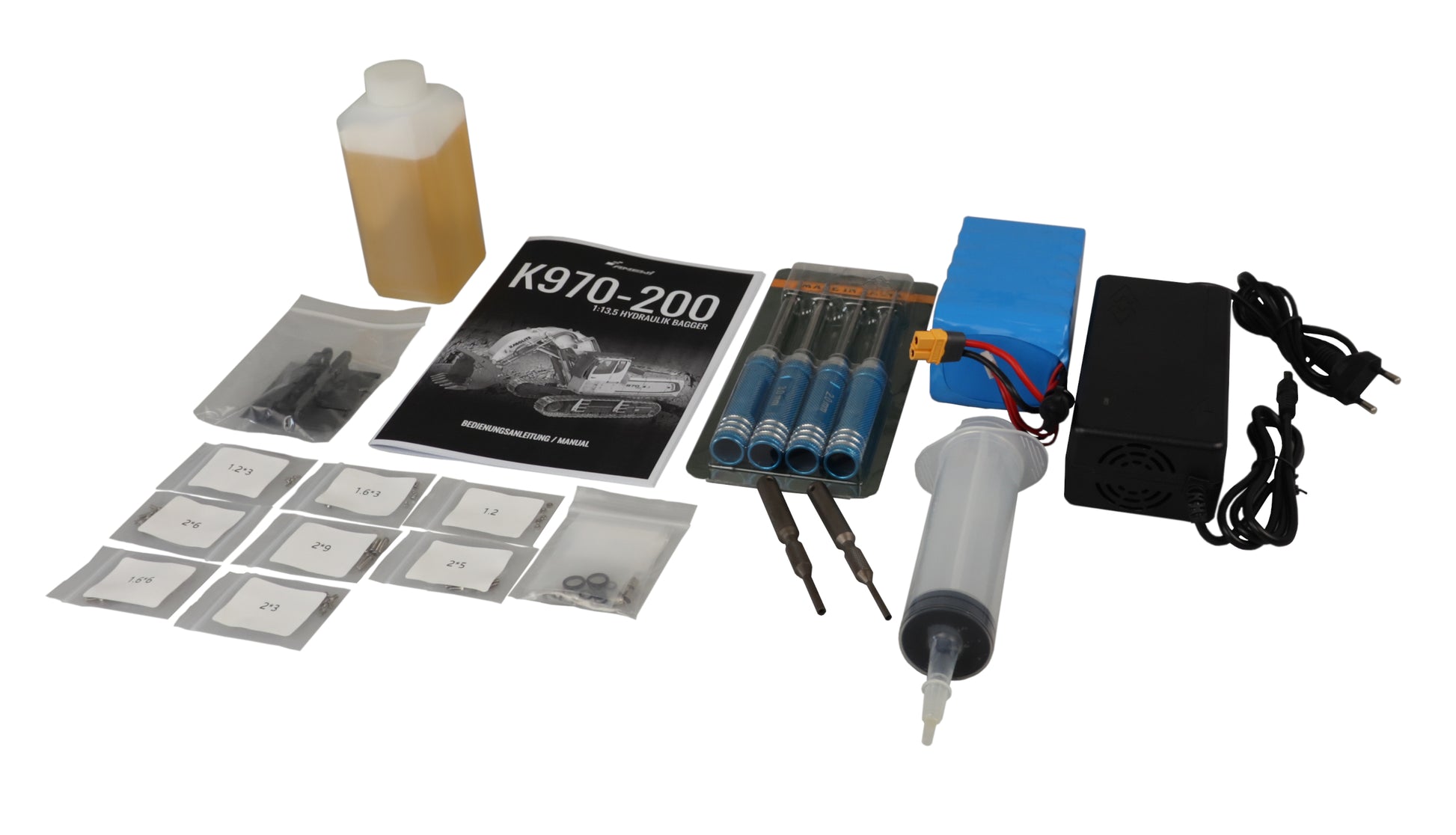 Zur Inbetriebnahme des Baggers muss lediglich der Battery vor der ersten Nutzung noch geladen And das Hydraulik-Oil eingefüllt werden. Dazu werden ca. 200ml des mitgelieferten Öls In den Tank gegeben. Anschließend kann der Spaß With dem neuen K970-200 sofort losgehen.