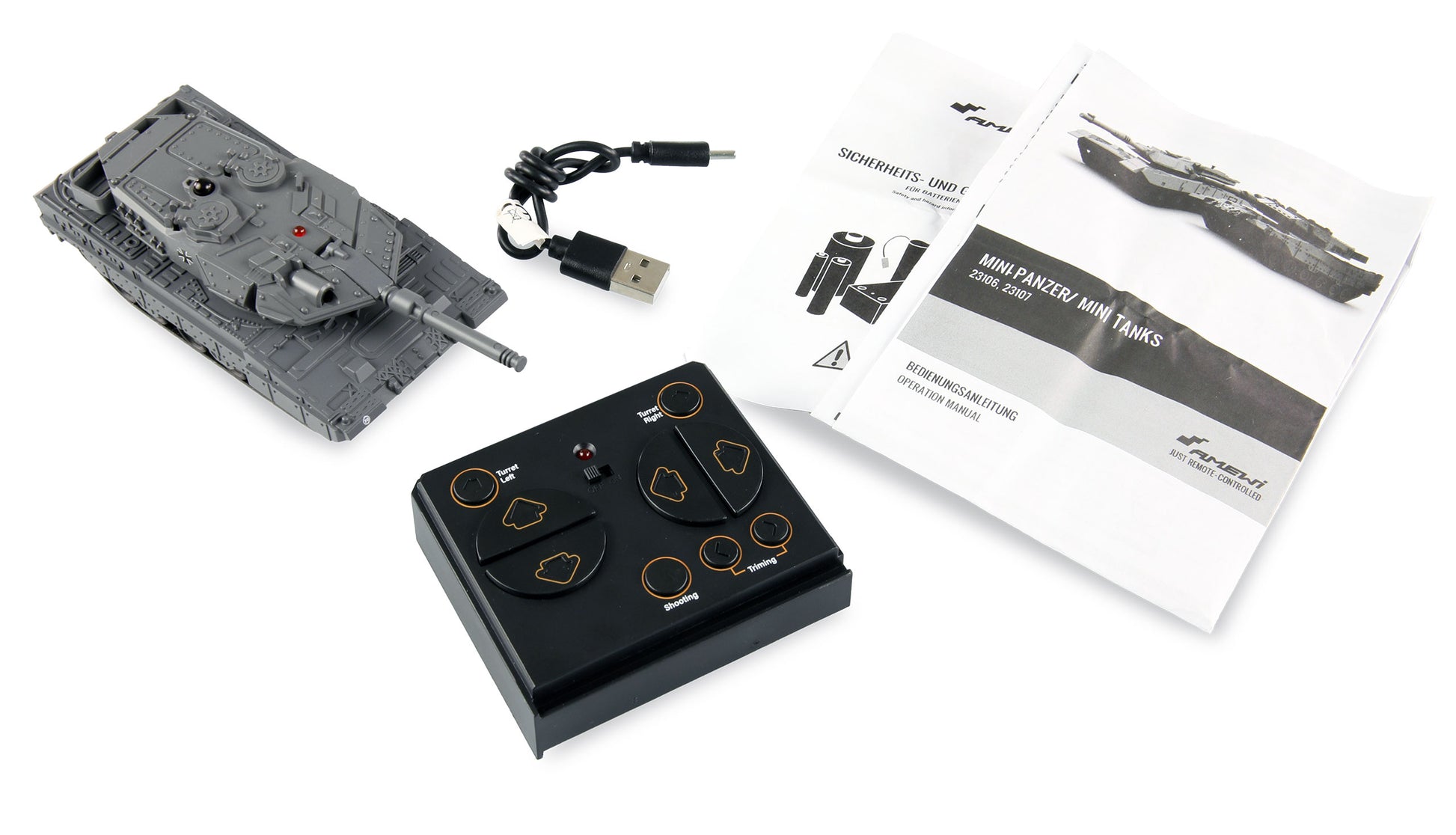 With dem verbautem Li-Ion Battery sind Fahrzeiten From bis To 15 Minuten möglich. Die bequem per Knopfdruck einstellbare Richtungstrimmung sorgt For einen guten Geradeauslauf. Der Mini-Panzer wird With einem USB-C-Ladekabel aufgeladen. For die Inbetriebnahme werden lediglich noch 2x AAA Mignon Batterien benötigt – schon kann der Einsatz beginnen.